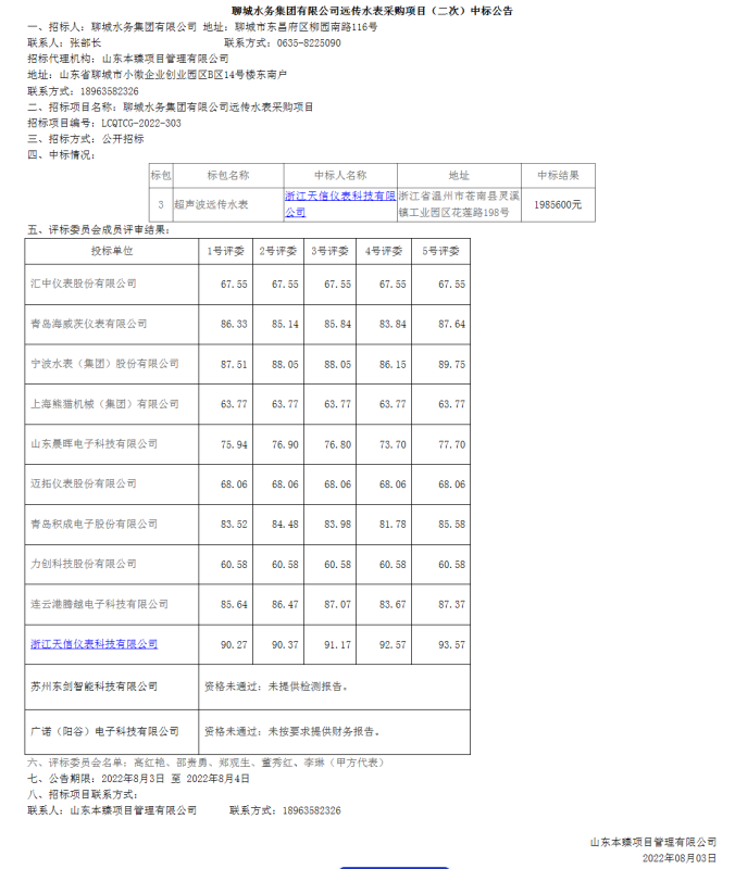 聊城水务集团有限公司远传水表采购项目成交公告