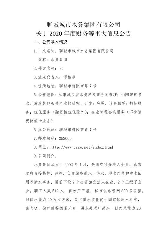 聊城水务集团有限公司关于2020年度财务等重大信息公告