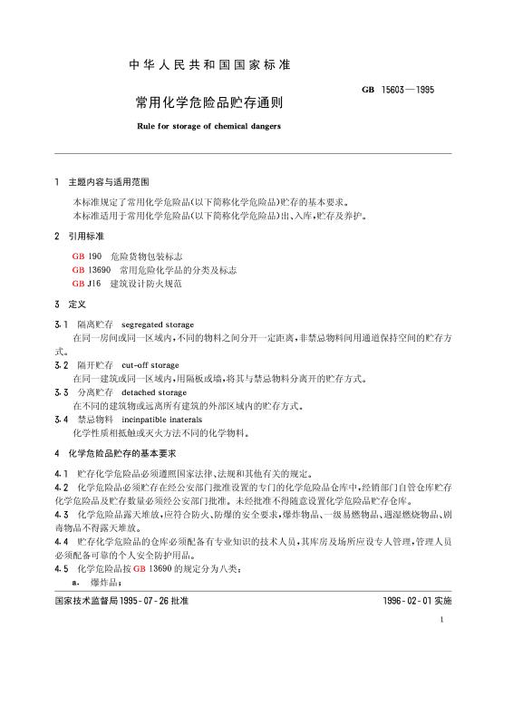 GB15603-1995常用化学危险品贮存通则