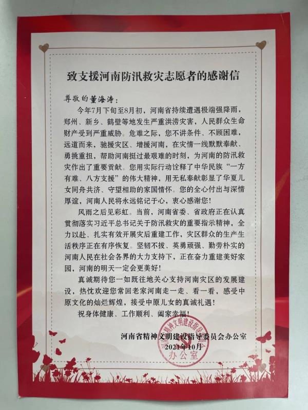 12月17日,一封来自河南省精神文明建设指导委员会的感谢信送到集团,向员工董海涛同志致以最真挚的感谢和赞许!
