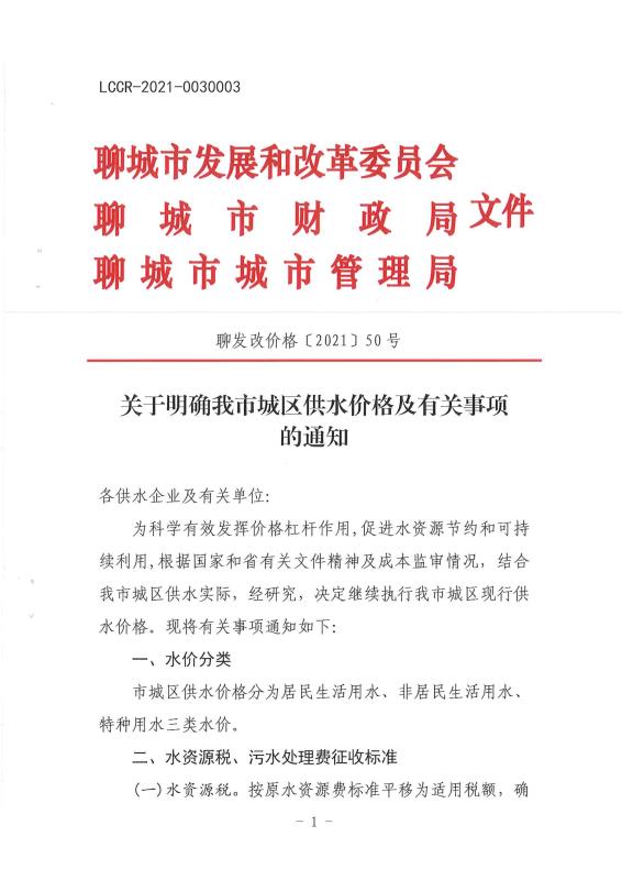 关于明确我市城区供水价格及有关事项的通知(聊发改价格【2021】50号)