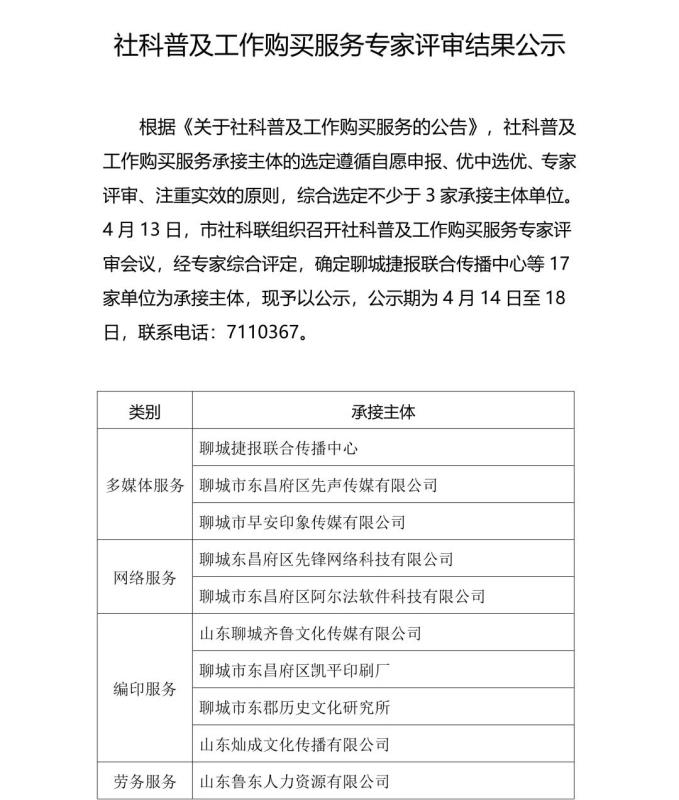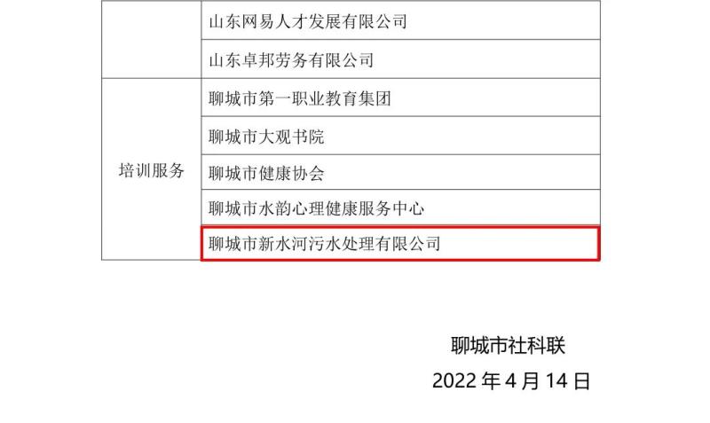 4月14日,聊城市社会科学界联合会下发《社科普及工作购买服务专家评审结果》,对社科普及工作购买服务承接主体单位进行公示,聊城市新水河污水处理有限公司被评定为培训服务购买单位。