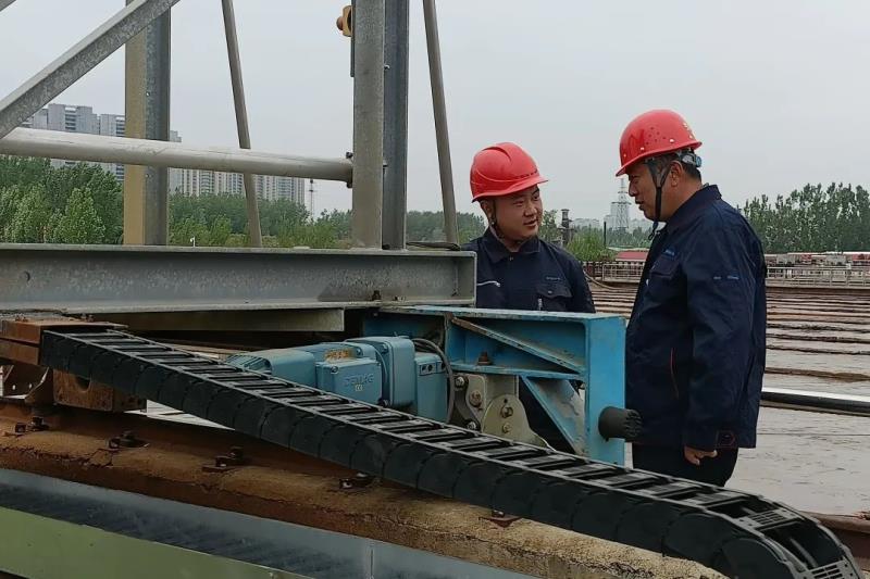 近日,水务污水公司设备管理科科长张龙飞来到二期生化澄清池行车前,观察行车的运行状况,了解行车技改后性能。