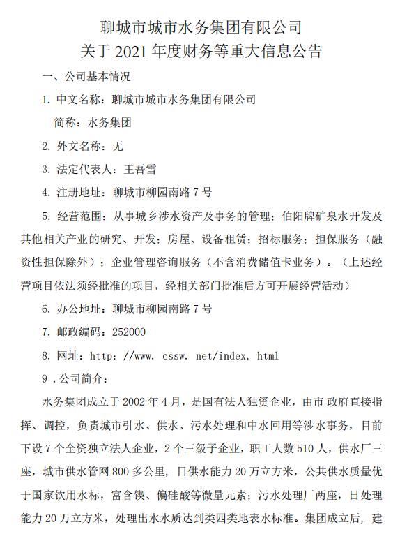 聊城市城市水务集团有限公司 关于 2021 年度财务等重大信息公告