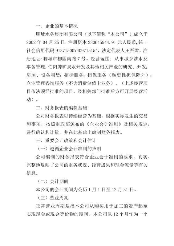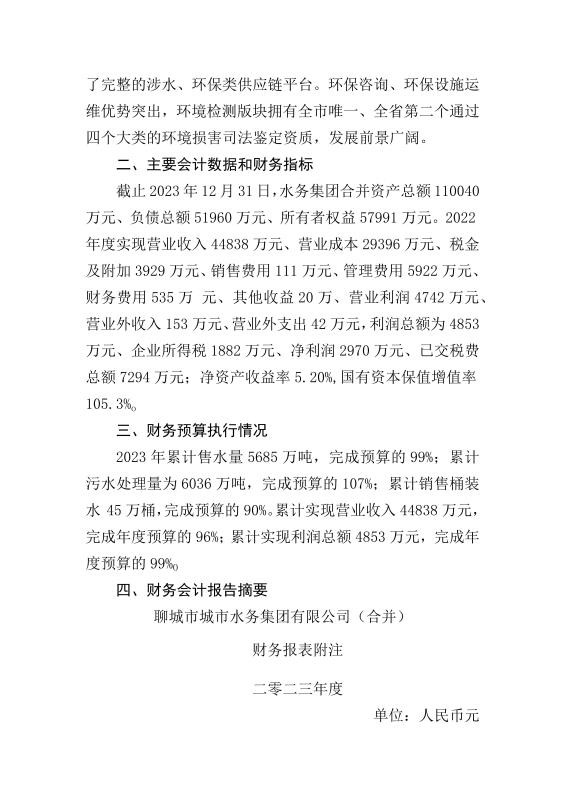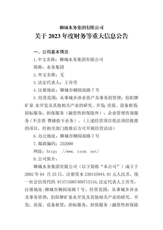 聊城水务集团有限公司关于2023年度财务等重大信息公告