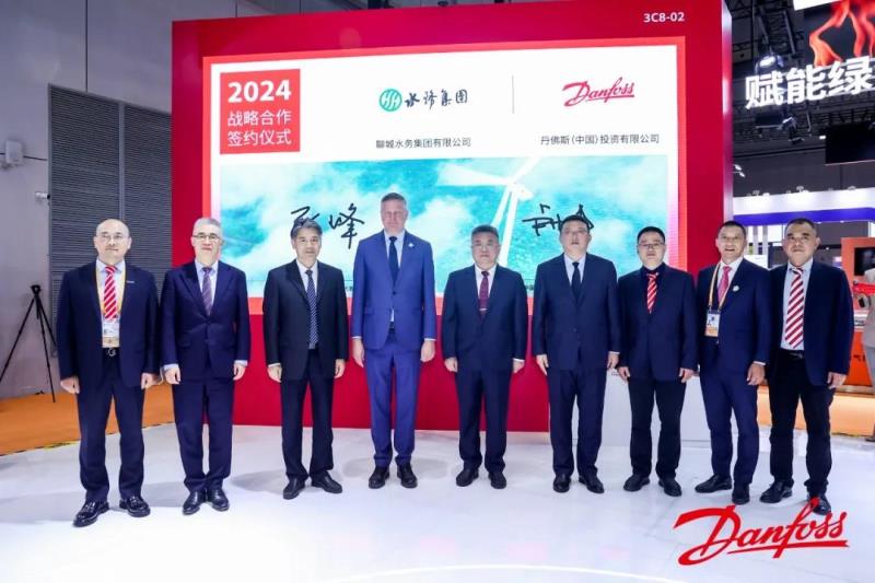 进博会上,聊城水务集团董事长王吾雪与丹麦王国驻华大使孔墨客、丹佛斯集团中国区总裁徐阳共同见证签订《关于水资源减碳示范项目的战略合作协议》。